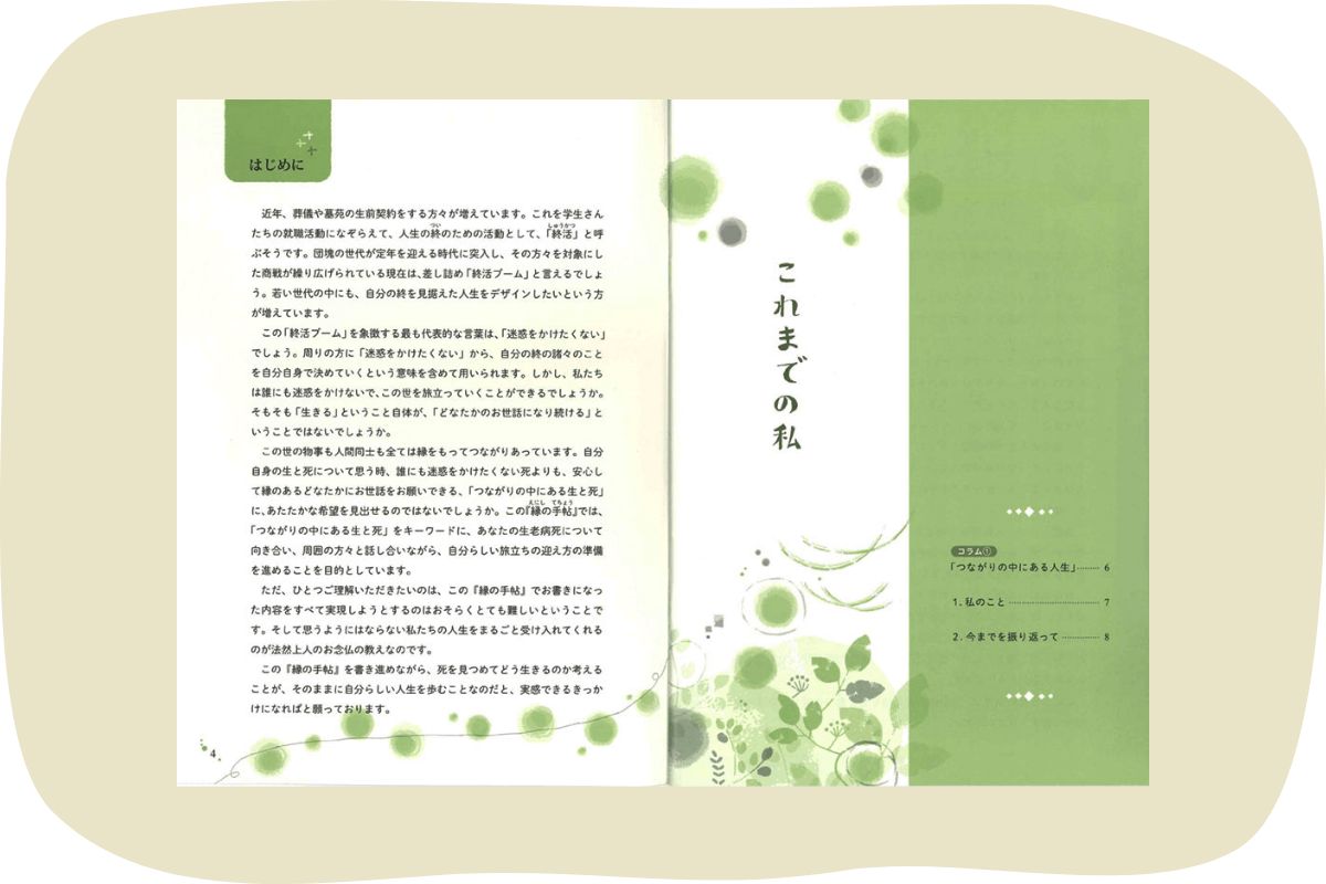 十念寺では、「縁の手帳」という法然上人の教えがちりばめられたエンディングノートを元に「つながりの中にある生と死」をキーワードに、生・老・病・死の課題に向き合います。